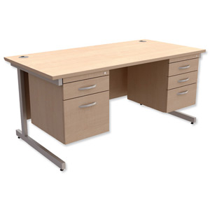 Rectangular with double pedestal. W1600xD800xH725mm. Cantilever desk. Two fixed pedestals. Silver legs. Maple..